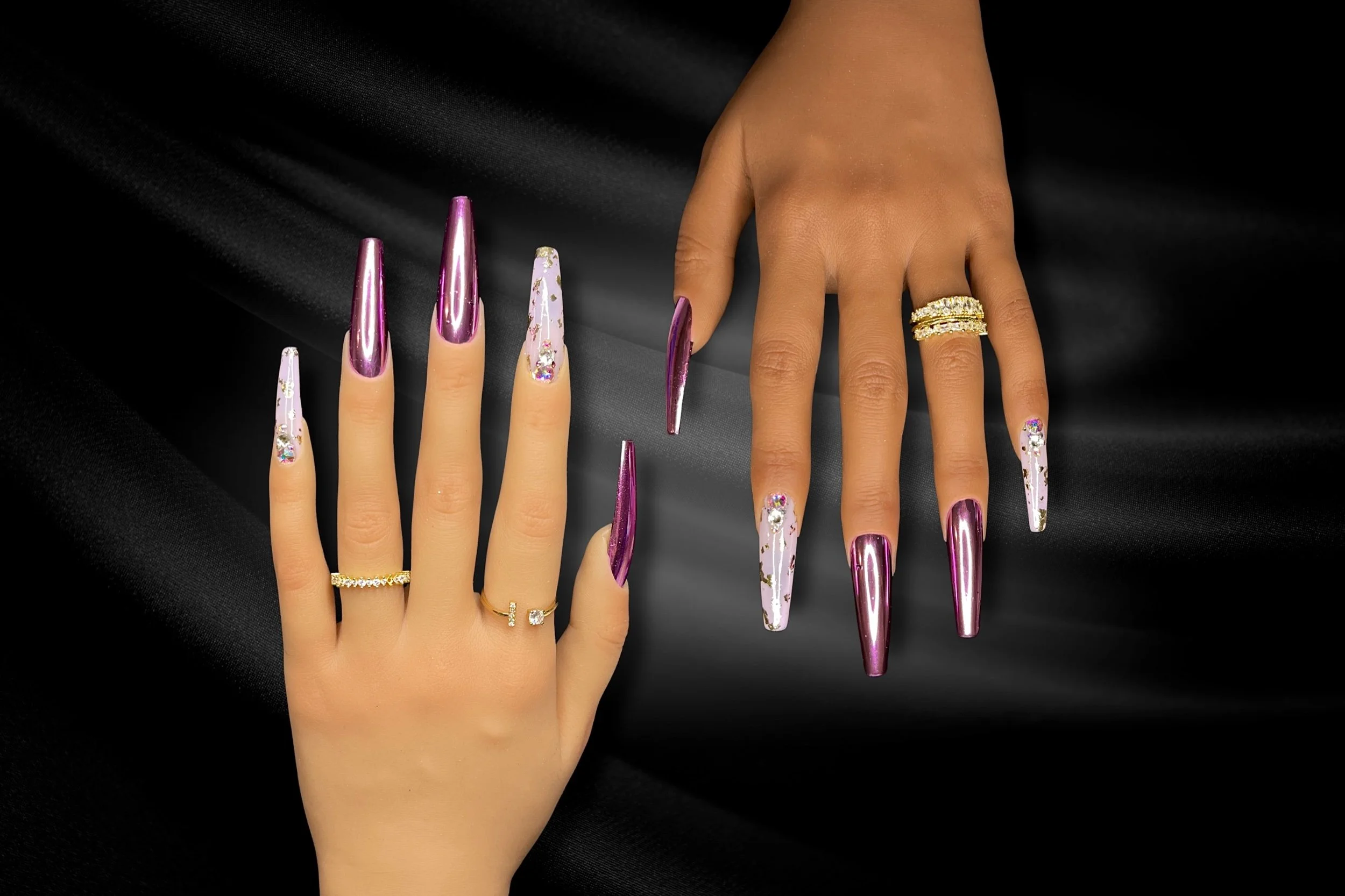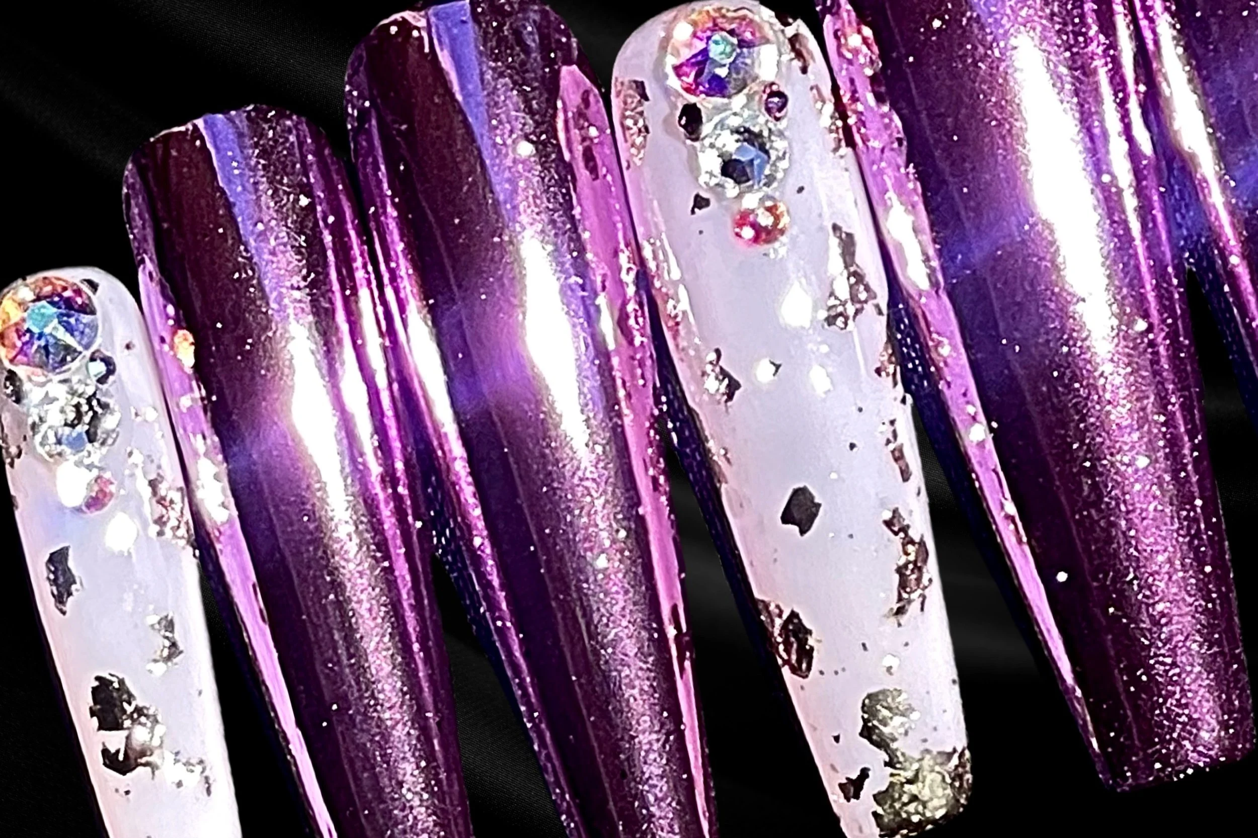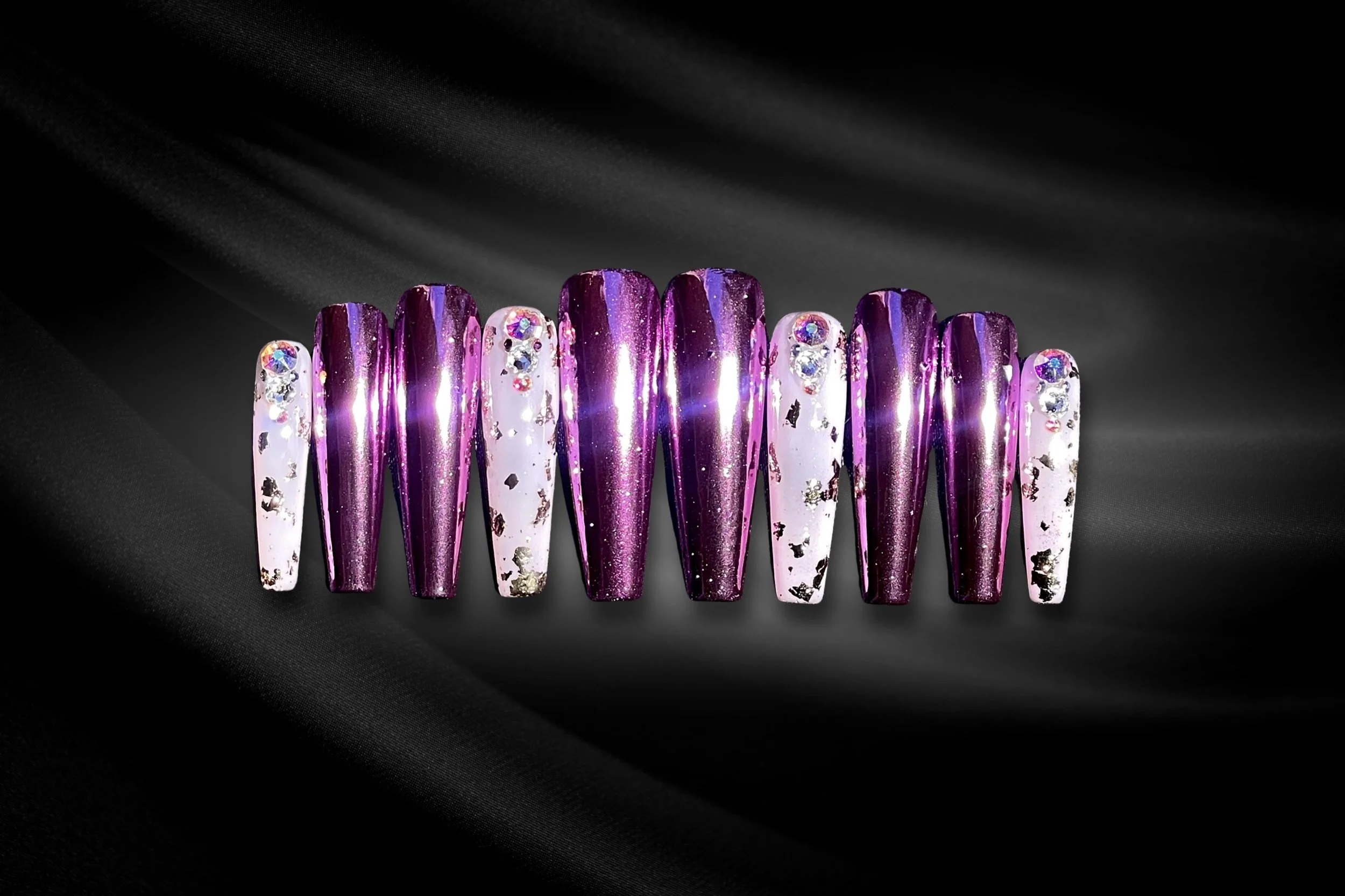 Angie features a blend of lavender chrome and soft milky lavender tones, accented with gold leaf and crystal embellishments for a strikingly bold, gleaming finish.